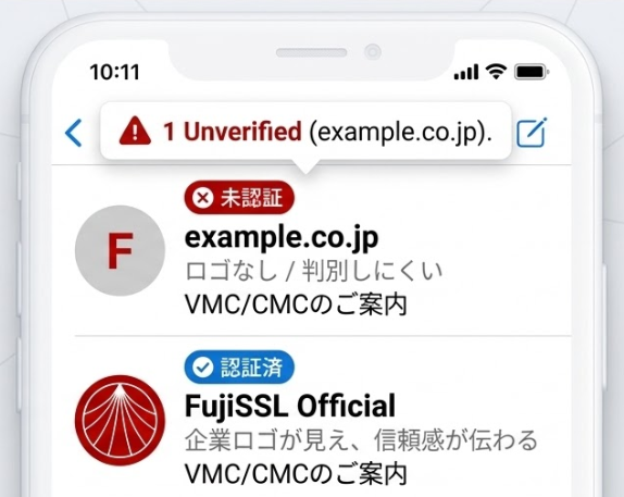 自社ロゴが取得できるか、どちらが適しているか、DMARCの設定状況も含めてFujiSSLがご案内します。